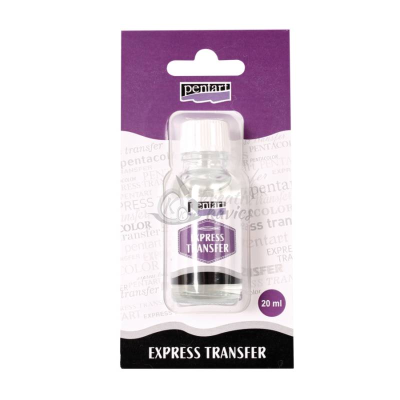 | Az expressz transzfer oldat lézerrel nyomtatott, színes vagy fekete-fehér képek sima felületre történő átvitelére szolgál. Nem csak papírra, natúr vagy festett fára, hanem selyemre, textilre, dekorgumira is transzferálhatunk vele. Használata egyszerű, az eredmény egyből látható: a felületre rögzített képet óvatosan itassuk át transzfer oldattal, fa spatulával enyhe nyomást kifejtve dörzsöljük át a képet. Távolítsuk el a papírt, majd lakkozással, textilek esetén vasalással fixáljuk a képet a felületen. |